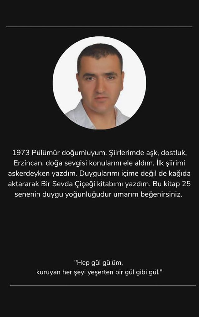 Şiirlerinde aşk, doğa, sevgi ve Erzincan’ı işleyen Halil Özkaya’nın “Bir Sevda Çiçeği” adlı kitabı okuyucuyla birkaç yıl önce buluşmuş. Özkaya’nın şiir kitabının sayfalarında sevginin gökkuşağı renkleriyle tanışıyorsunuz.